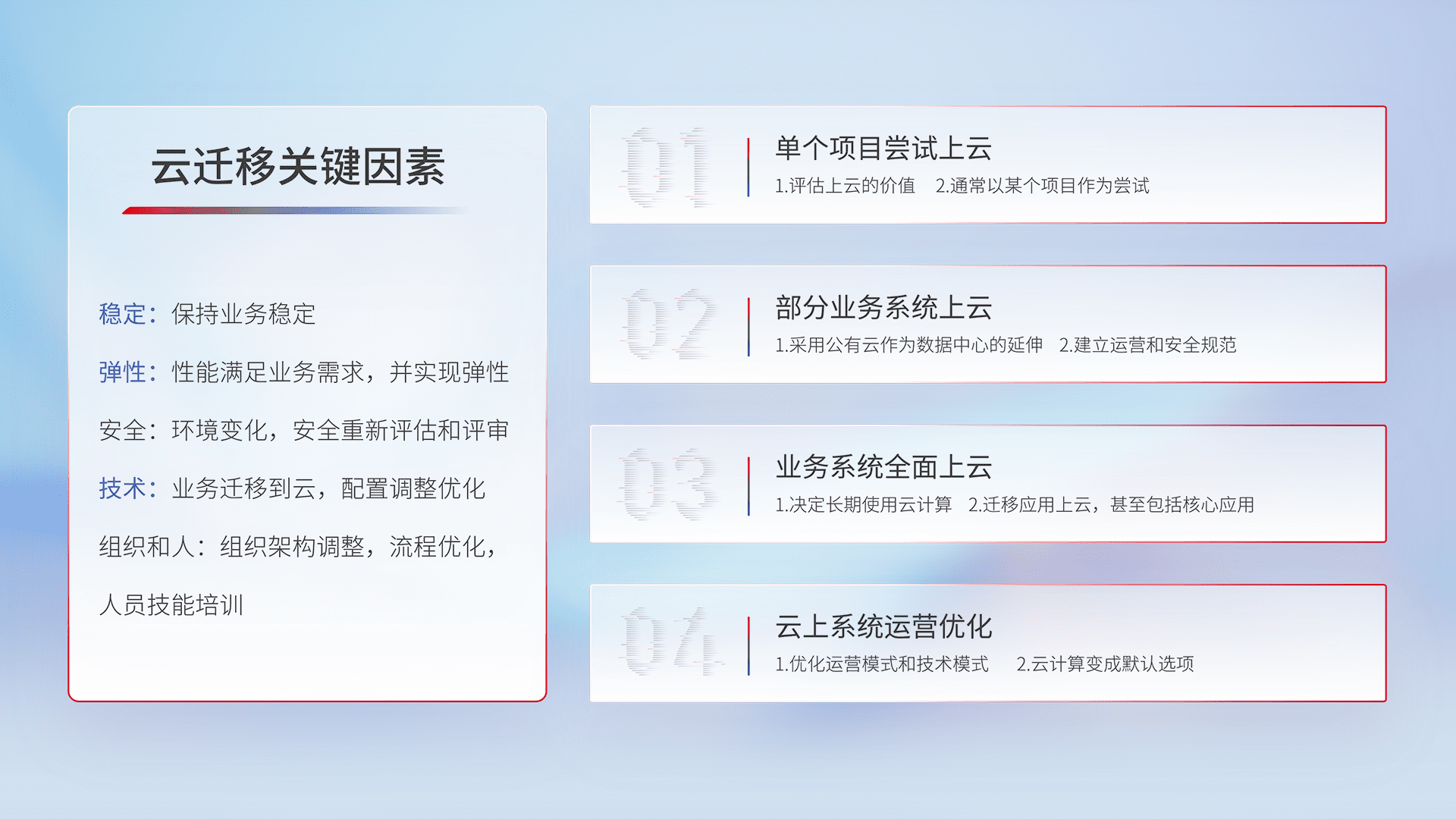 结合实际业务,,,,从规划设计、、、云平台选型、、云原生改造、、、、数据迁移、、、集成交付,,,迁移全过程为客户识别最佳上云路径,,做好风险识别管理,,设计网络架构、、身份权限、、、安全审计合规、、操作审计、、、、日志审计、、监控告警策略、、多站点容灾设计等,,,对云上基础设施进行整体规划,,,,提升IT治理水平,,,以满足弹性、、高可用、、、高性能的需求。。