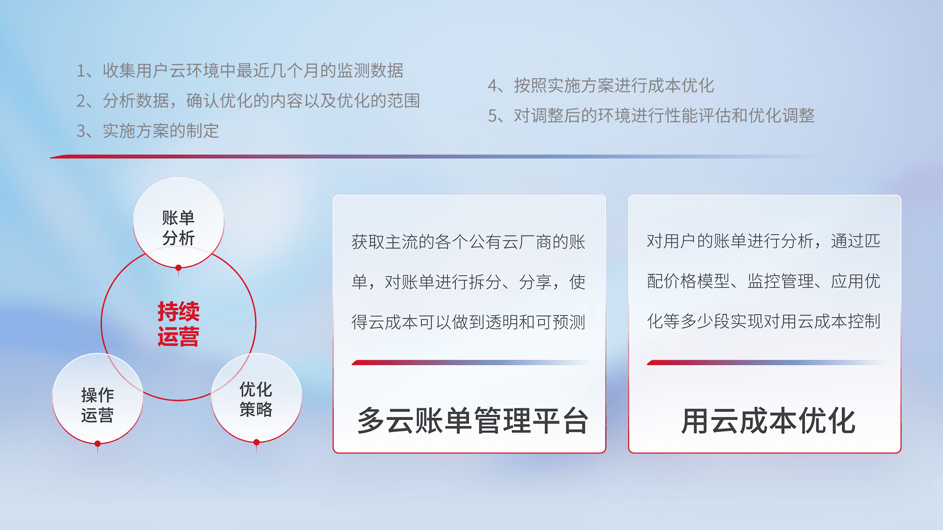 通过多云纳管,,,以统一的资源数据模型把客户的云资源进行抽象和封装,,进而实现对多云资源的统一操作,,,保障云资源管理的可靠性、、稳定性与可用性。。。量身定制化运维内容,,,,配置、、、开发运维、、、补丁管理、、备份、、监控、、、、认证和访问管理、、审计和日常巡检等,,,保障在用云过程中的可靠度,,稳定度以及高可用率。。。。